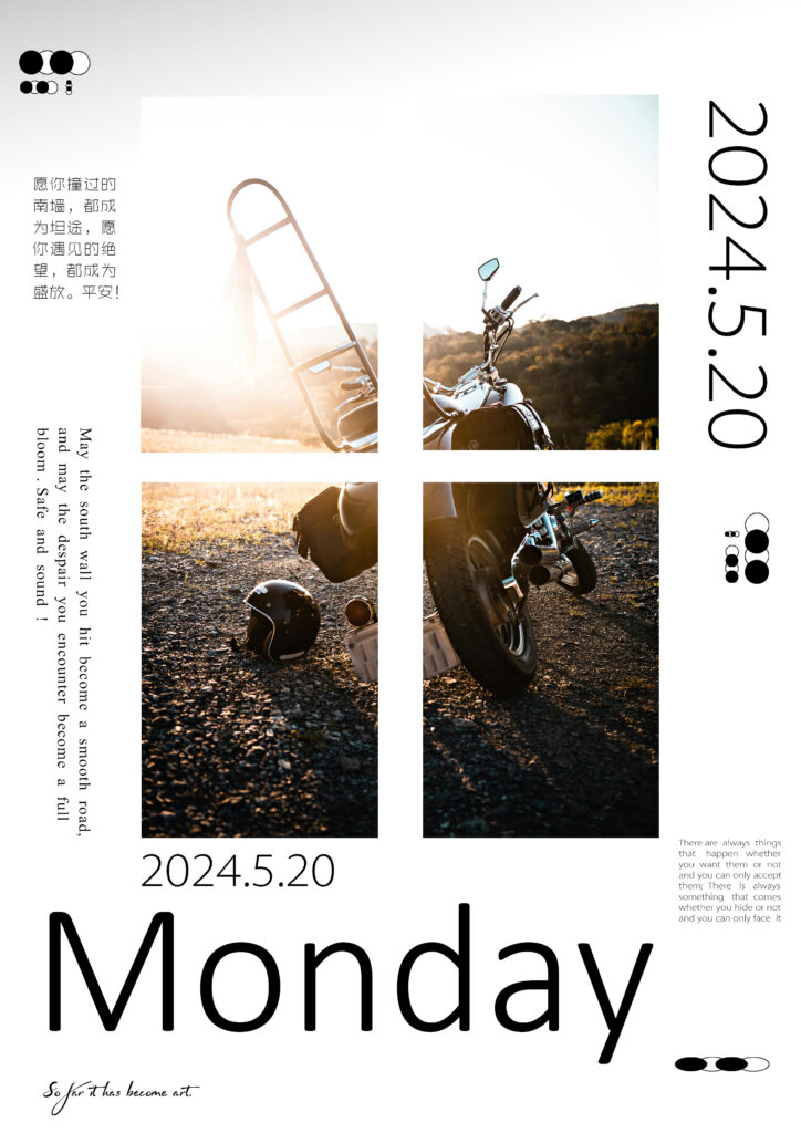 It is presented in a collage – style image, combining elements related to cycling. With dates and the word “Monday”, and combined with text, it conveys expectations for daily life. The overall style is fresh and full of a sense of life, as if recording a beautiful moment in an ordinary day full of hope.