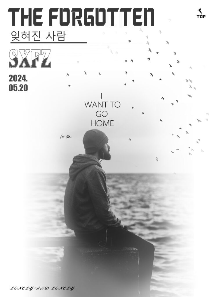It uses a black – and – white image of a person by the sea with flying birds to express a sense of loneliness and the longing for home.