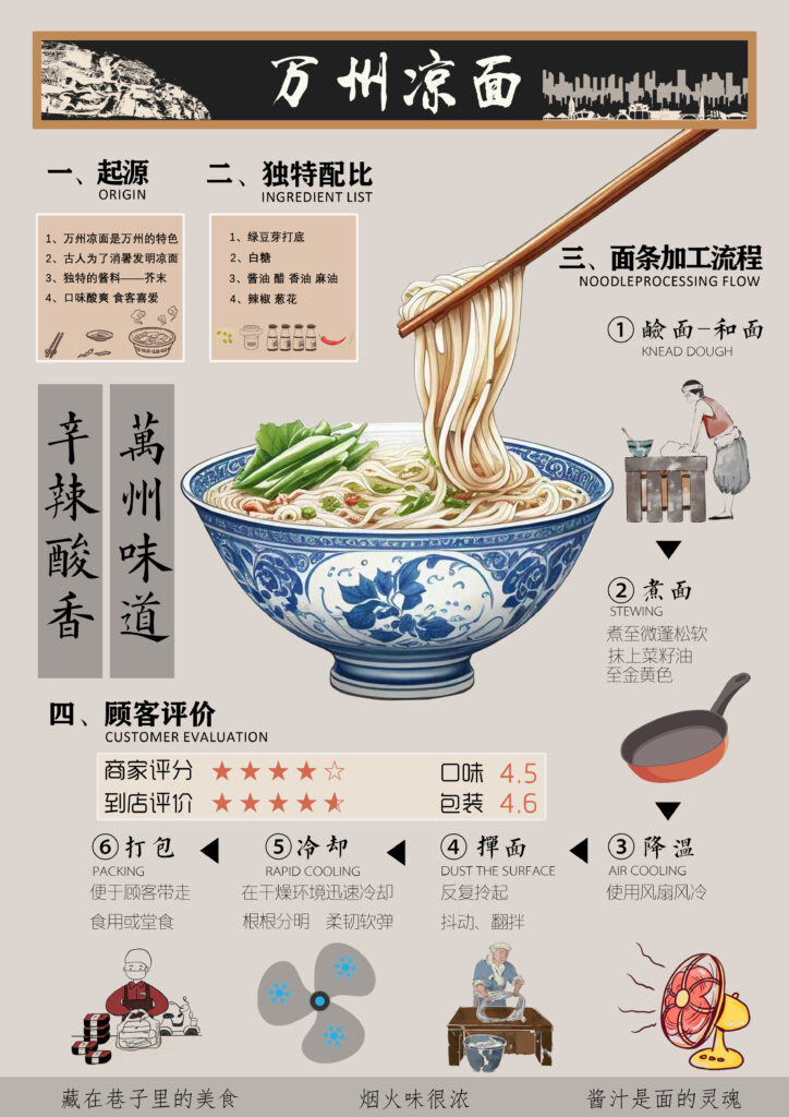 This poster introduces Wanzhou cold noodles comprehensively. It covers the origin, unique ingredient ratio, noodle processing flow, and customer evaluations. With vivid illustrations and clear text, it showcases the charm of this delicacy, emphasizing its spicy and sour flavor and the rich 烟火气 (fireworks atmosphere, representing the warmth of daily life).
