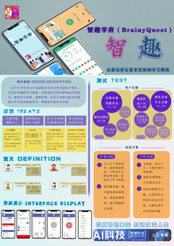 This poster showcases the “BrainyQuest” college student learning plan system. It details aspects like design ideas, definitions, interface displays, tests, and improvement plans. Through clear sections and visual elements, it presents how the system, combining website and mobile app, offers personalized, flexible, and interesting learning experiences, aiming to help college students study efficiently and achieve academic goals.