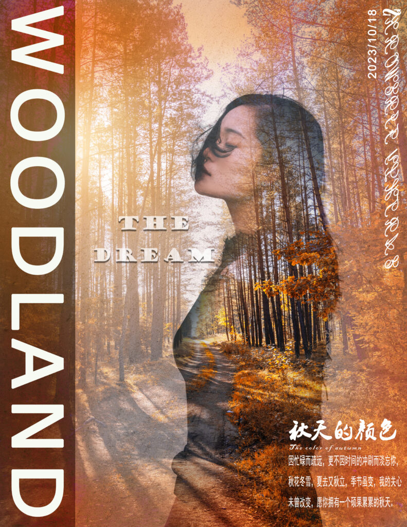 The poster uses double – exposure technique to blend a figure with an autumn forest scene. Warm autumnal tones and poetic text create a dreamy atmosphere, conveying the beauty and unique feelings of autumn, and evoking viewers’ affection for the season.