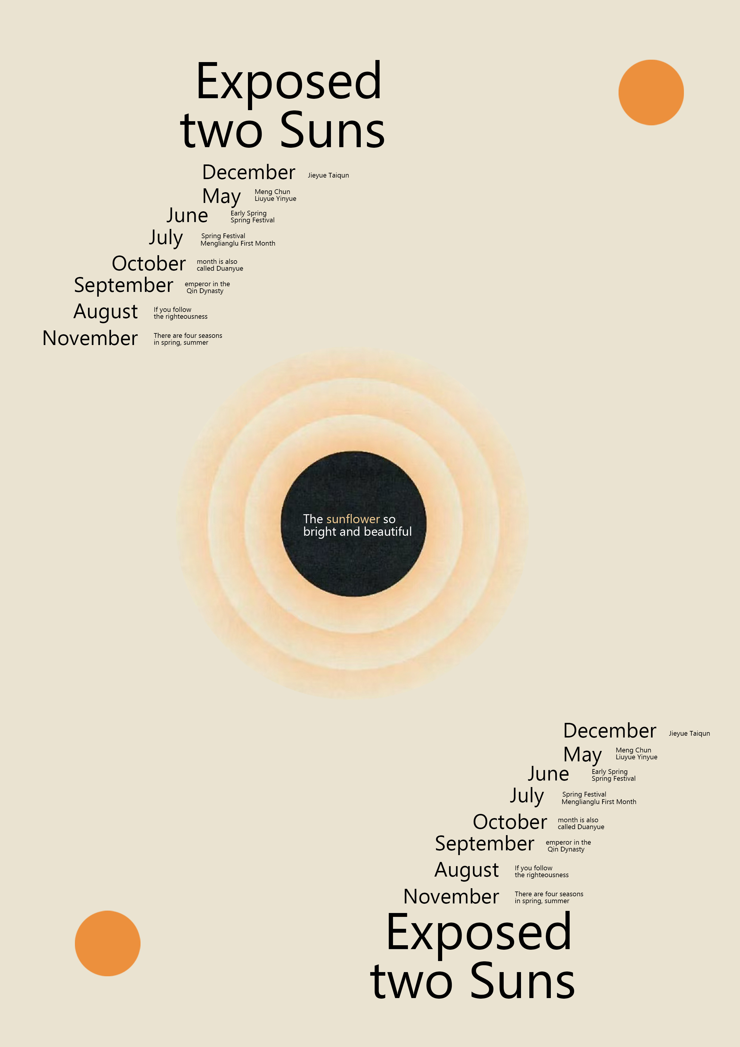 It adopts a simple layout and warm colors. With the theme of “Exposed two Suns”, combined with text information such as dates, it constructs an imaginative picture through abstract elements like circles. It conveys a sense of fantasy and mystery about “double suns”, triggering viewers’ thinking and reverie about the theme.