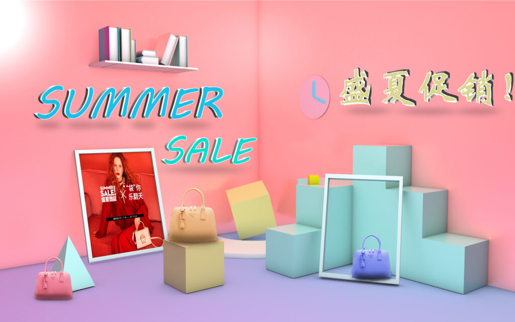 This C4D work builds a summer promotion scene. Using soft and bright colors like pink and light blue, along with three – dimensional geometric shapes and product models, it creates a lively and attractive shopping atmosphere. The prominent “SUMMER SALE” and “盛夏促销!” texts clearly convey the promotional theme, aiming to catch the audience’s attention and stimulate consumption desire.