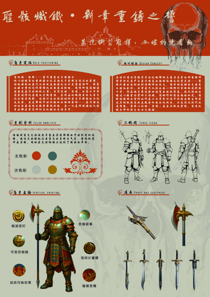 This character design poster centers on an armored warrior. It presents the role positioning, design concept, color analysis, three – views, vertical painting, and props in detail. The use of rich and bold colors, along with meticulously designed armor and weapons, creates a medieval fantasy style. It aims to shape a vivid and powerful warrior image, allowing viewers to feel the charm of the character full of stories and combat power.
