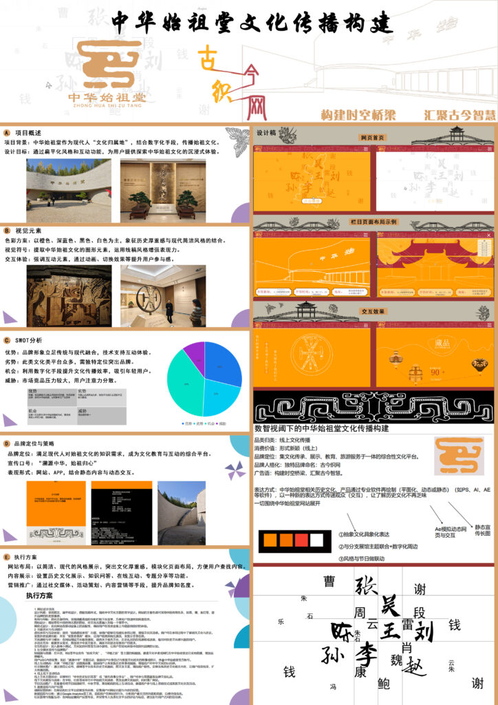 This poster focuses on the cultural communication construction of the Chinese Ancestral Hall. It elaborates on project overview, visual elements, SWOT analysis, brand positioning and dissemination, implementation plan, and digital – oriented cultural communication construction. By integrating ancient and modern design concepts, using appropriate color schemes and visual symbols, it aims to build a space – time bridge, gather ancient and modern wisdom, and provide users with an immersive experience of Chinese ancestor culture through digital means and interactive functions.