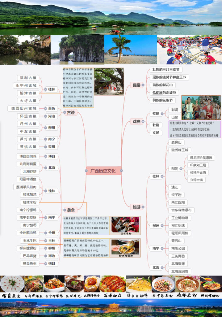 This mind map comprehensively presents Guangxi’s culture, including historic sites, folklore, cuisine, and tourist attractions. With clear categorization and rich images, it offers a vivid overview of Guangxi’s diverse charms, serving as a helpful guide for understanding the region.
