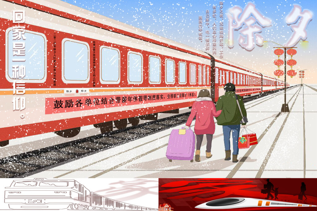 The poster centers on the theme of going home for New Year’s Eve. It uses a red train, a snowy scene, and people with luggage to vividly depict the strong yearning for home. The prominent “New Year’s Eve” and the message “Going home is a kind of faith” further emphasize the deep – seated emotion of returning home during the festival, creating a warm and emotional atmosphere.