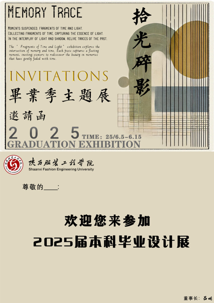 The graduation exhibition invitation adopts a retro and artistic style. With the theme of “Memory Trace”, it combines text and abstract visual elements to create a sense of time and memory. The clear display of the exhibition time and organizer makes the invitation both aesthetically pleasing and informative, inviting people to participate in the graduation design exhibition and share the achievements of graduation.
